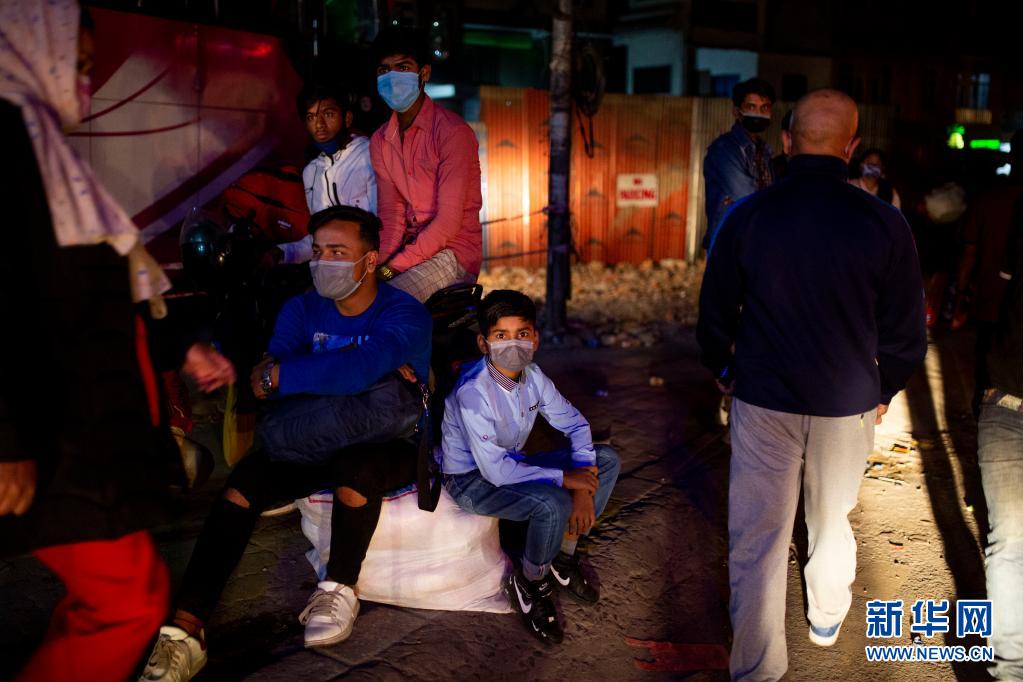 4月28日晚,人們在尼泊爾首都加德滿都的路邊等車,準備在封禁措施實施前離開加德滿都返回家鄉。