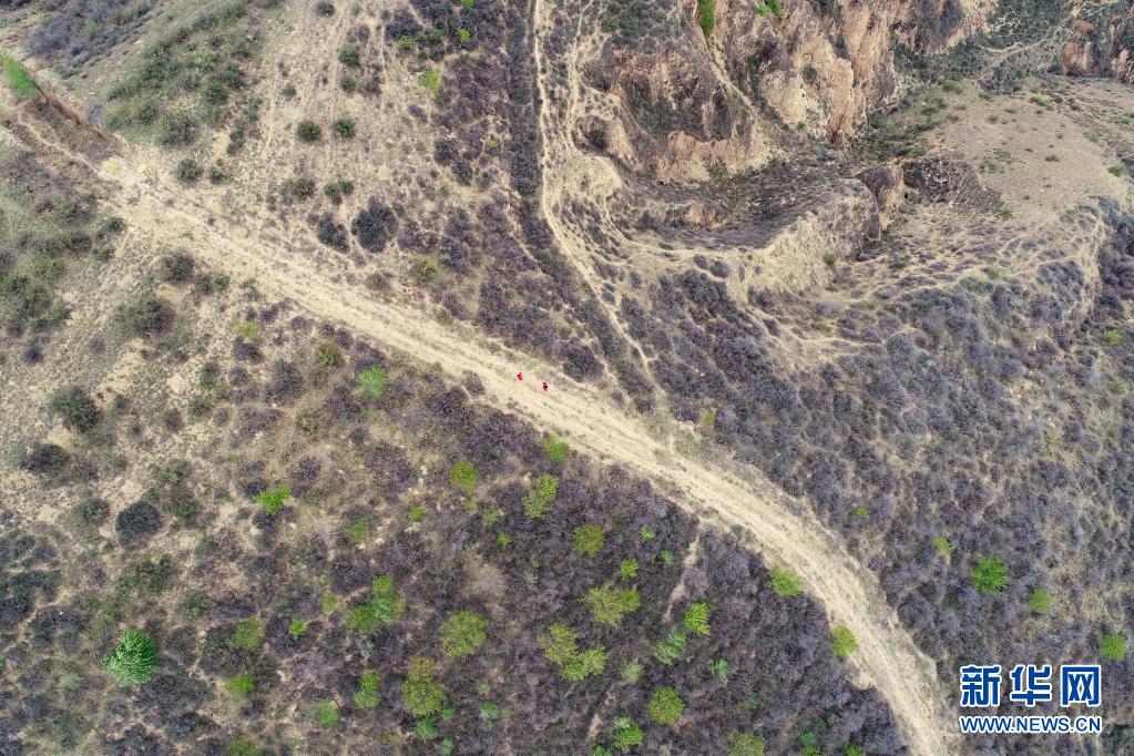 4月27日,延長氣田采氣二廠巡線隊員在巡線途中(無人機照片)。