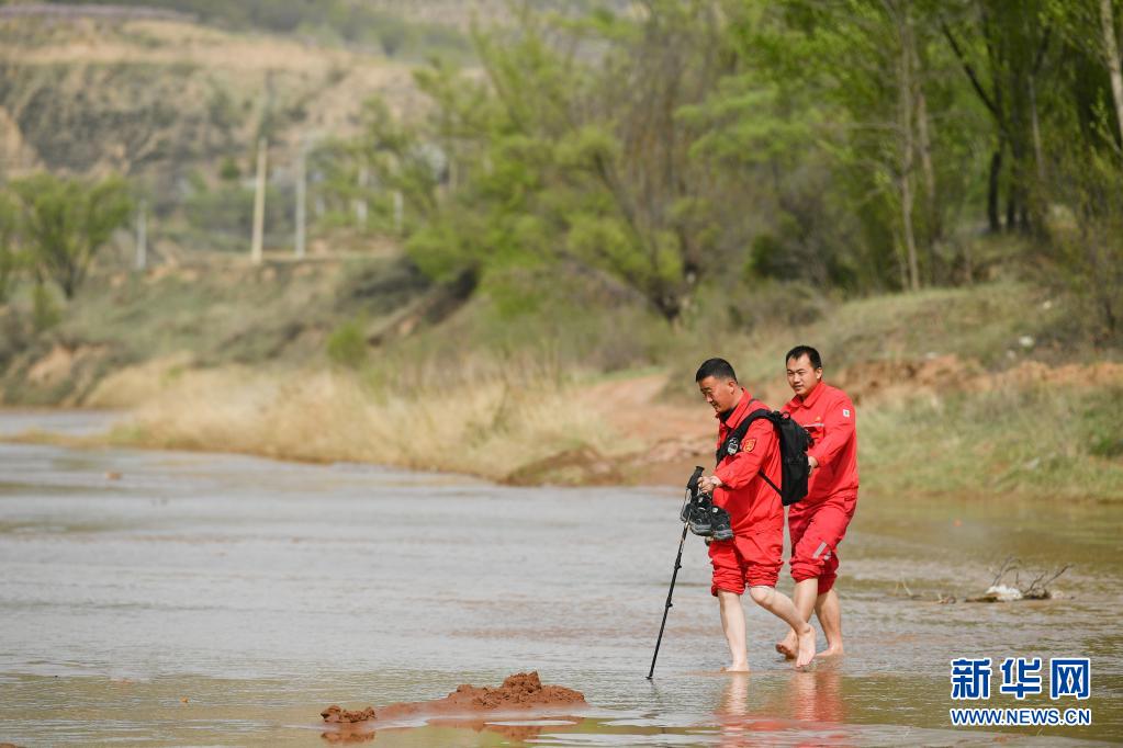 4月27日,巡線隊員張偉偉(右)、張浩軍在巡線途中渡河。新華社記者 張博文 攝