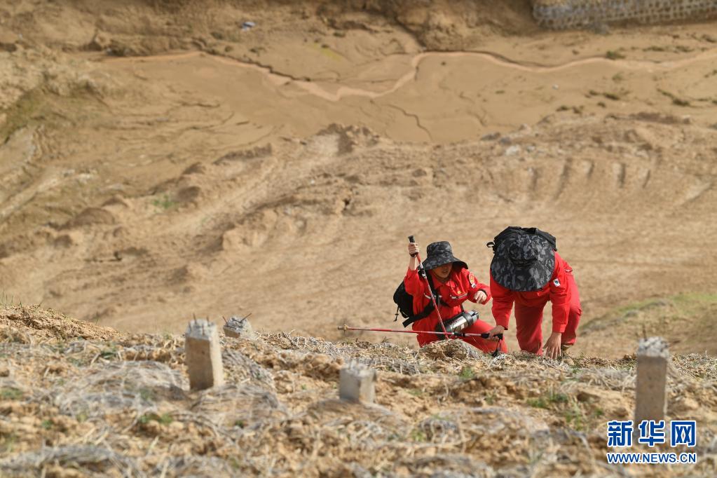 4月28日,巡線隊員侯勵峰、曹碩(左)在巡線途中。新華社記者 張博文 攝