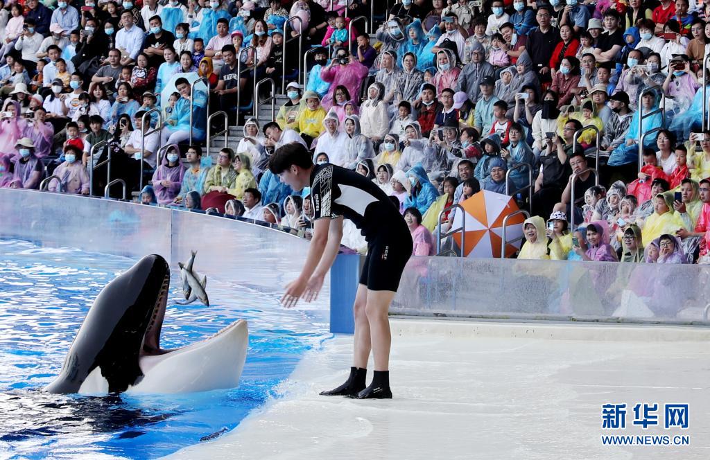 5月1日,飼養員在虎鯨科普秀活動中給虎鯨投喂小魚“獎勵”。