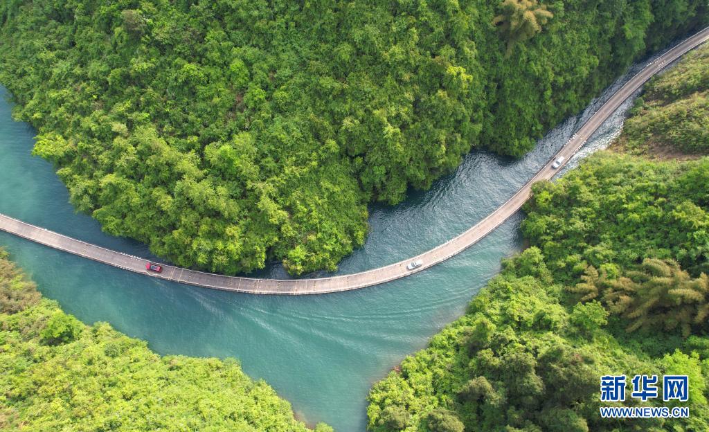 5月2日,游客在湖北省恩施土家族苗族自治州宣恩縣獅子關景區水上棧道駕車游玩(無人機照片)。新華社發(王俊 攝)
