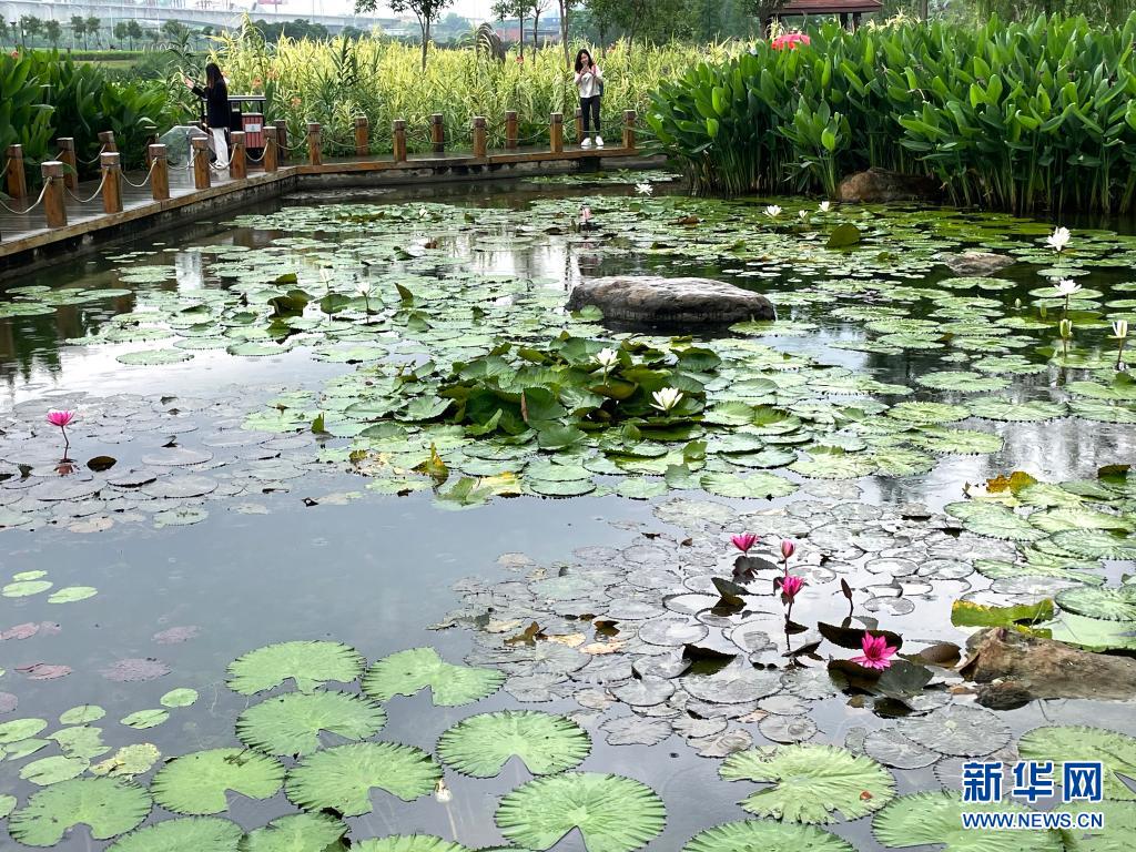 立夏時節,廣西南寧市那考河濕地公園內草木吐翠、鮮花斗艷,一派繁茂景象。