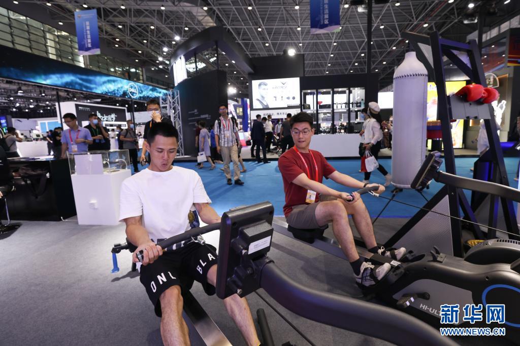 5月7日,觀眾在消博會現(xiàn)場體驗劃船機。
