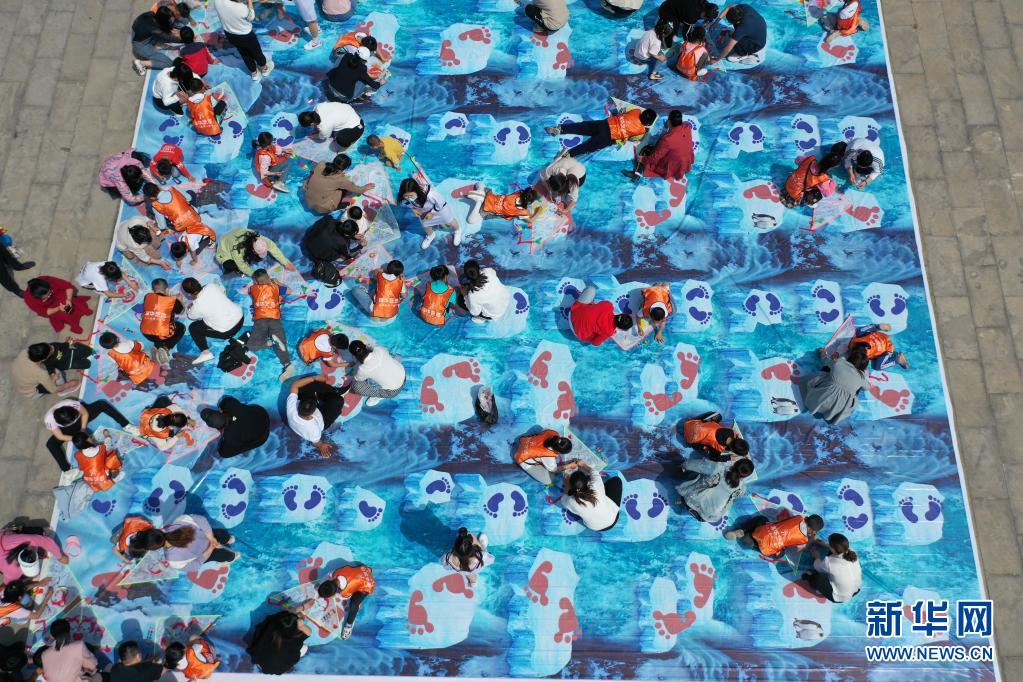 5月9日,在河北省新河縣南湖公園,孩子們跟媽媽一起繪制風箏(無人機照片)。