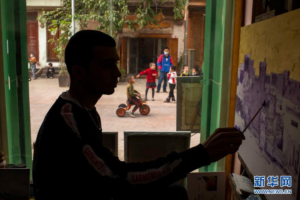 麥麥提吐?tīng)栠d江·麥麥提依明在位于新疆喀什古城景區(qū)的工作室內(nèi)進(jìn)行創(chuàng)作(5月5日攝)。新華社記者 胡虎虎 攝