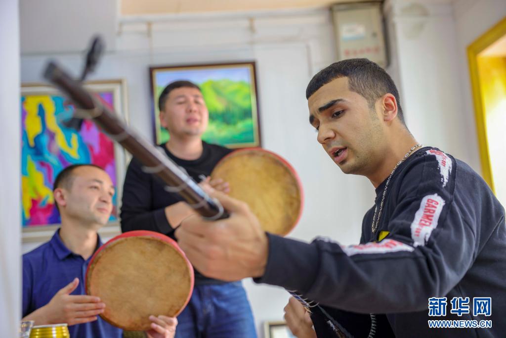 麥麥提吐爾遜江·麥麥提依明(右)在工作室內和朋友唱歌(5月5日攝)。新華社記者 胡虎虎 攝