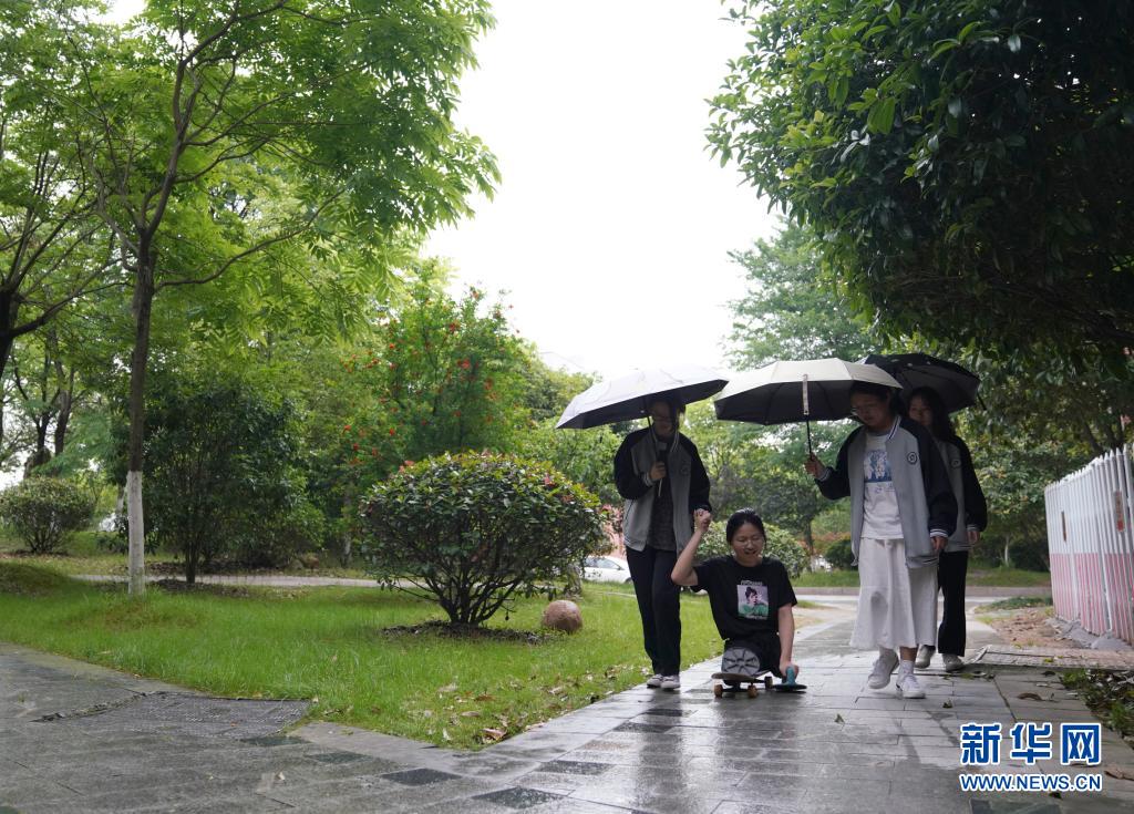 16歲的蔣張子怡是江西上饒中學高中一年級的學生。2010年一場車禍奪去了她的雙腿,如今的她只能依靠滑板代步,用雙手前行,為此,大伙都稱她“滑板姑娘”。