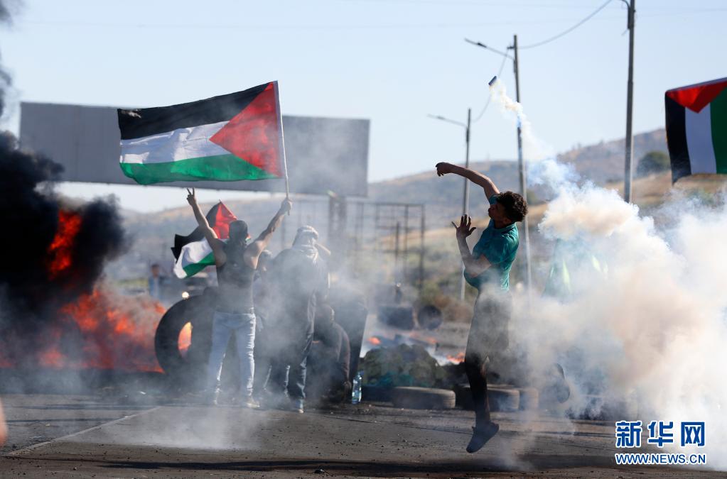 5月18日,一名巴勒斯坦示威者在約旦河西岸城市納布盧斯附近的沖突中向以色列士兵扔回催淚彈。