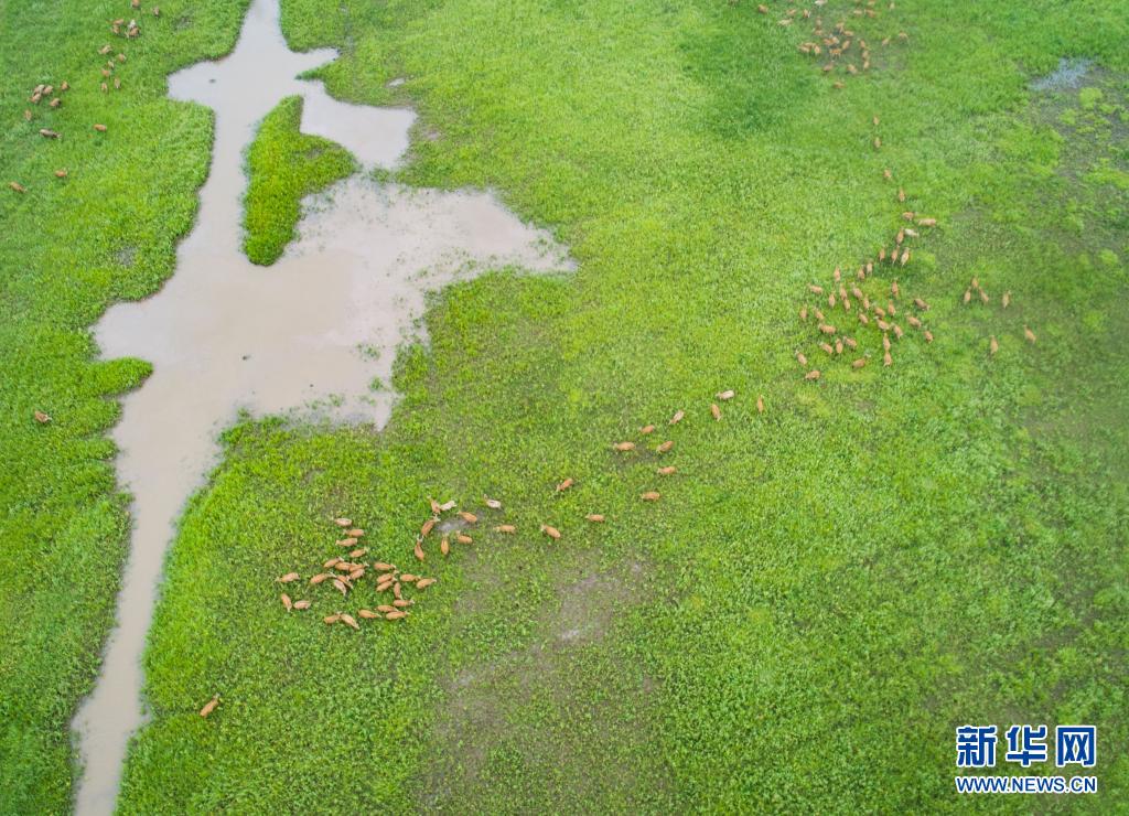 5月17日,一群麋鹿在石首麋鹿國家級自然保護區內活動(無人機照片)。新華社記者 肖藝九 攝