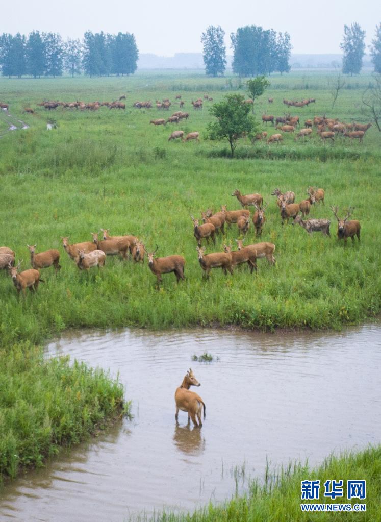 5月17日,一群麋鹿在石首麋鹿國家級自然保護區內活動(無人機照片)。新華社記者 肖藝九 攝