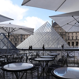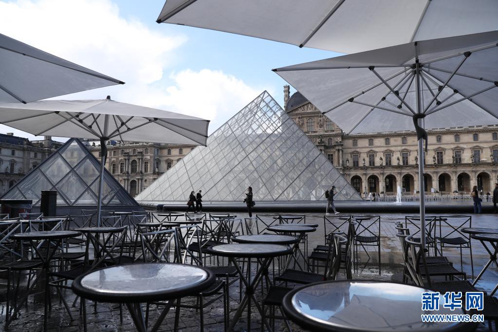 5月19日,法國巴黎盧浮宮博物館旁的餐館戶外區域準備迎客。
