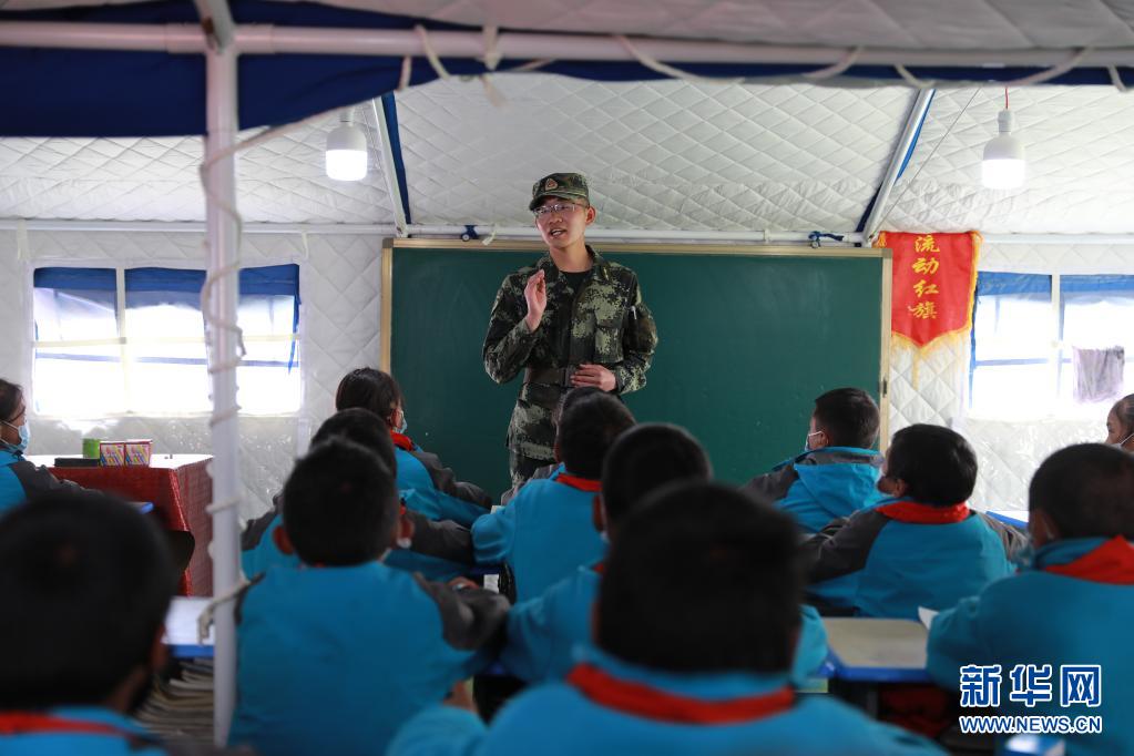 5月24日,武警青海總隊果洛支隊機動大隊排長張國睿為花石峽鎮藏文中心寄宿制小學的孩子上課。新華社記者 劉芳 攝