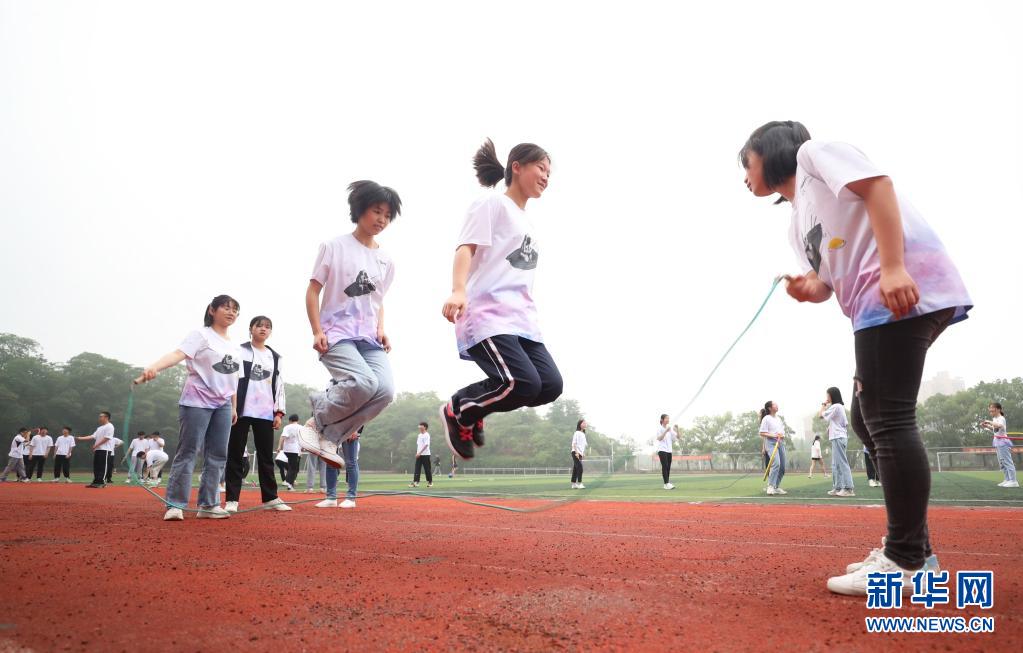 5月25日,湖南省衡陽市衡陽縣第一中學的高三學生在晨練中跳繩。