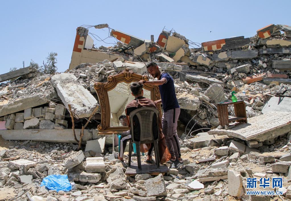 5月26日,在加沙地帶北部的城鎮(zhèn)貝特拉希亞,23歲的巴勒斯坦理發(fā)師阿卜杜拉·扎瓦拉在他被以色列炸毀的房屋前為顧客免費(fèi)服務(wù)。 新華社發(fā)(里澤克·阿卜杜勒·賈瓦德攝)