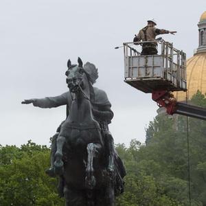 5月26日,工作人員在俄羅斯圣彼得堡清潔“青銅騎士”雕像。