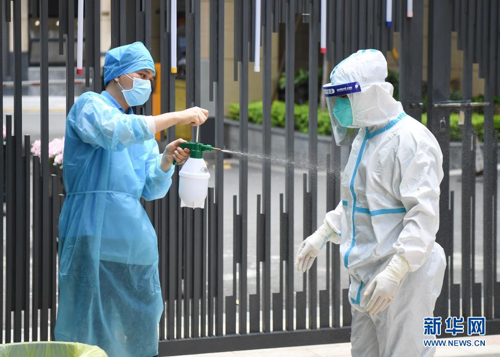 5月27日,在廣州荔灣區(qū)白鶴洞街道一小區(qū)檢測點,荔灣區(qū)骨傷科醫(yī)院的醫(yī)護(hù)人員給換班下來的同事噴灑消毒液。新華社記者 鄧華 攝