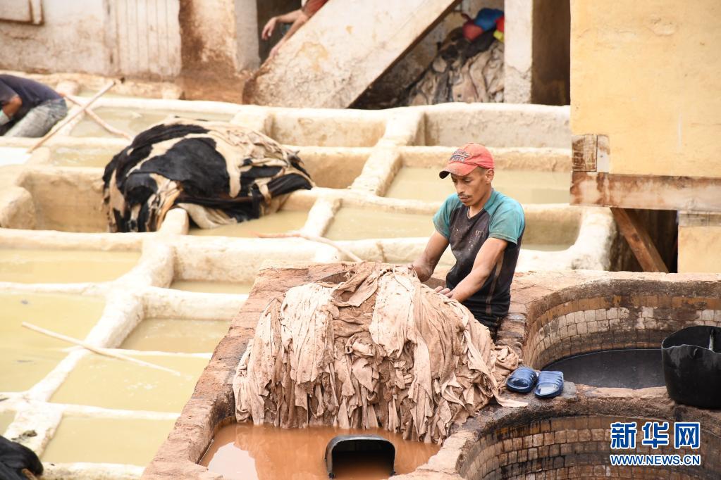5月30日,工人正在摩洛哥非斯古城內的皮革染坊中勞作。