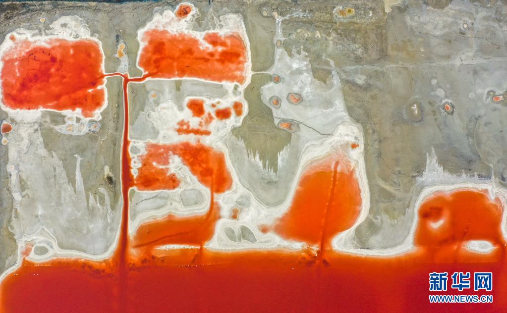 近日,隨著氣溫不斷升高,山西運城鹽湖呈現五彩斑斕的景象。