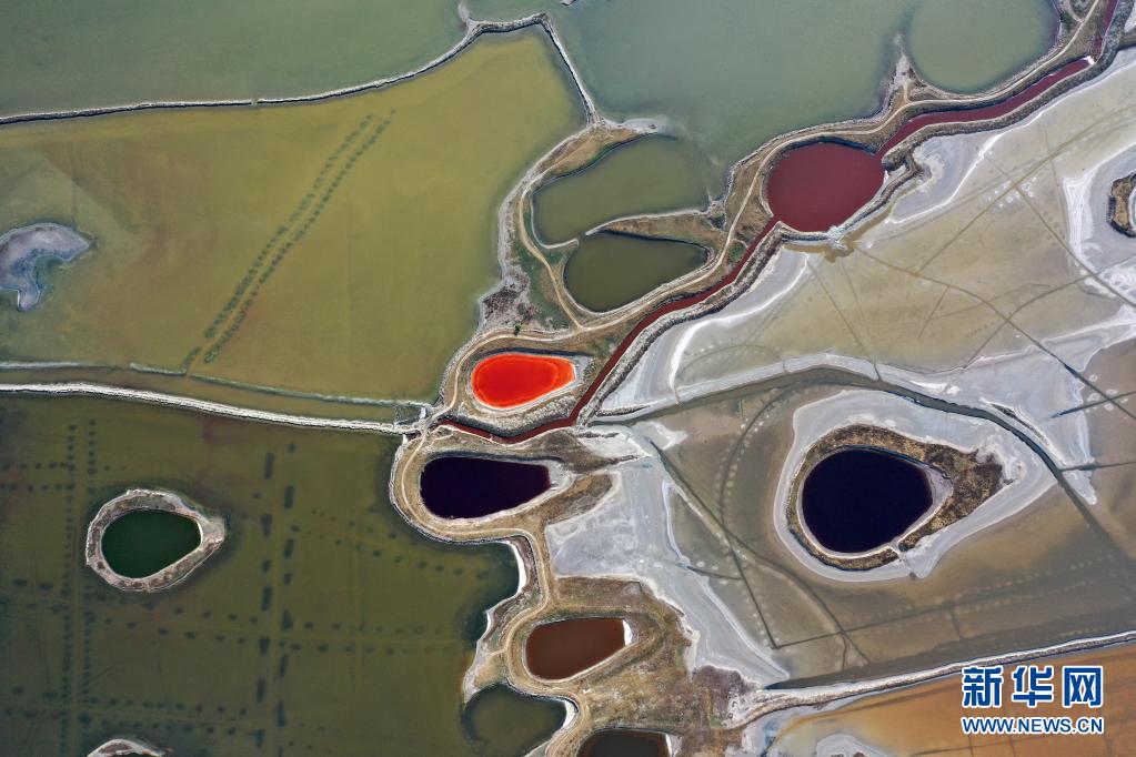 近日,隨著氣溫不斷升高,山西運城鹽湖呈現五彩斑斕的景象。