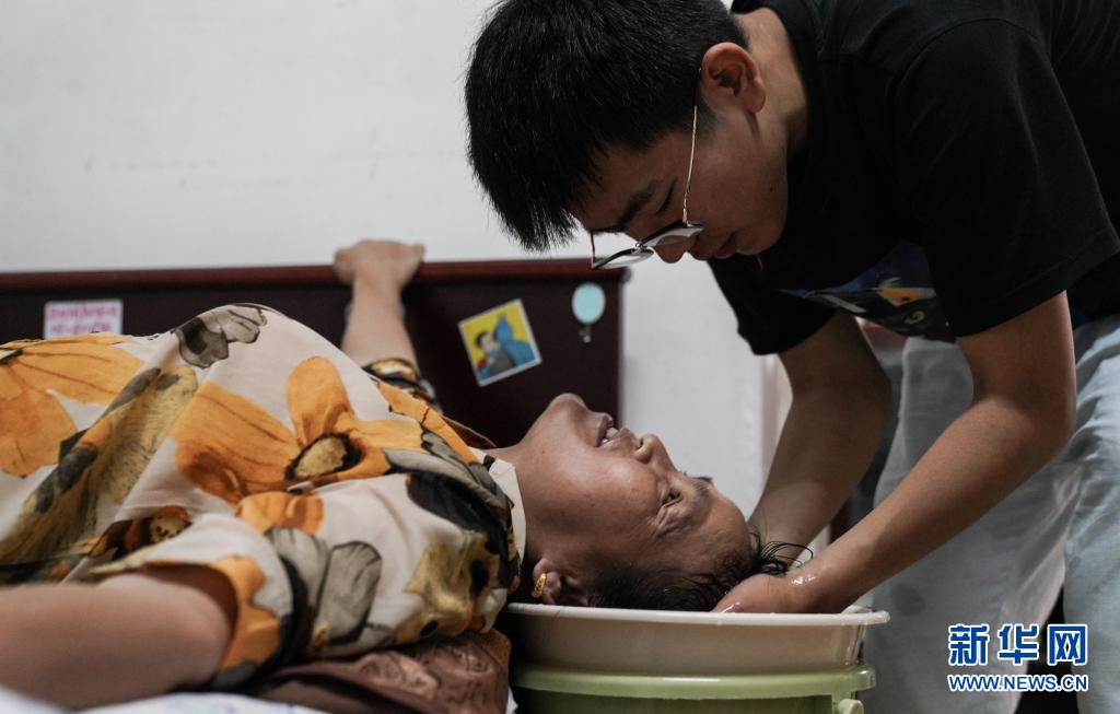 6月1日,趙建軍在宿舍內為母親洗頭。新華社記者胡晨歡攝