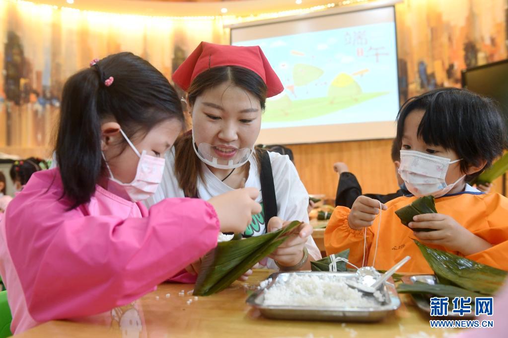 6月10日,石家莊市橋西區第三幼兒園的小朋友在包粽子。