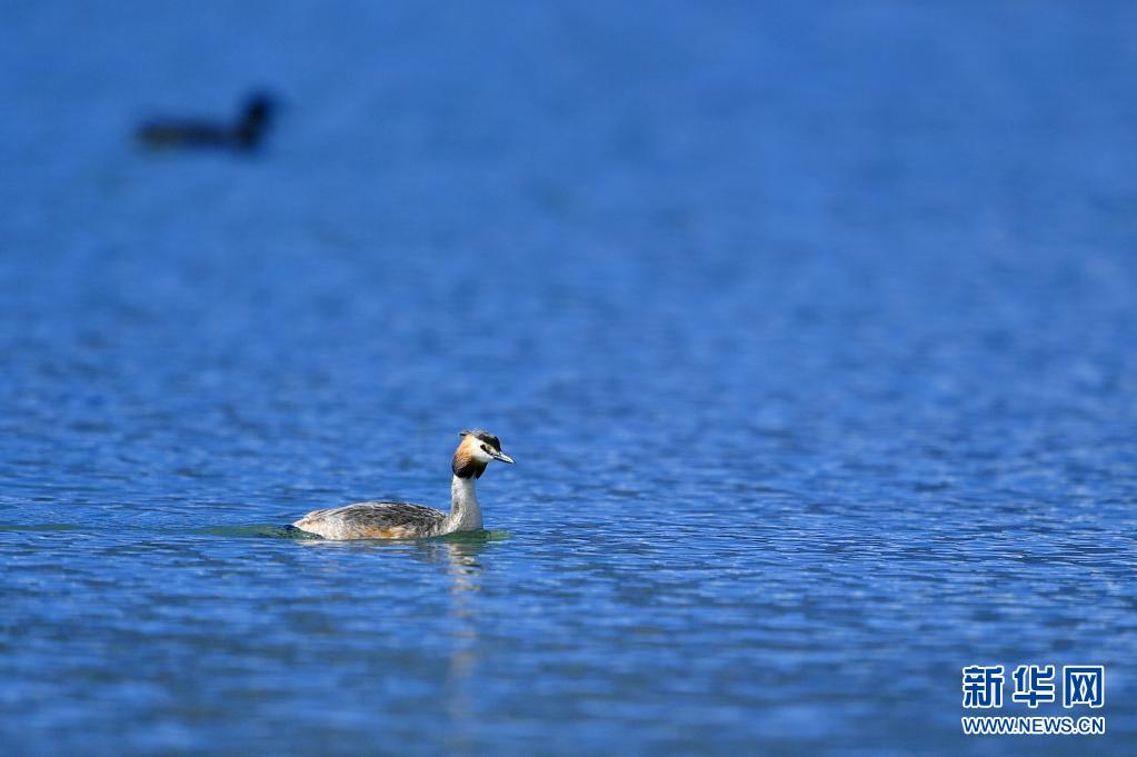 6月14日在拉魯濕地拍攝的鳳頭??。夏日里,鳳頭??和小??在西藏拉薩拉魯濕地國家級自然保護區(qū)水面上嬉戲。新華社記者 張汝鋒 攝
