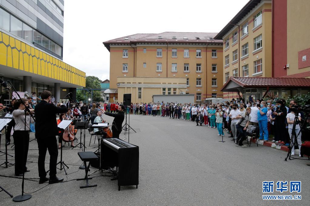 當日,羅馬尼亞首都布加勒斯特一個樂隊在該國一家傳染病醫院——馬太·巴爾什醫院演出,向抗擊新冠疫情的醫務工作者致謝。