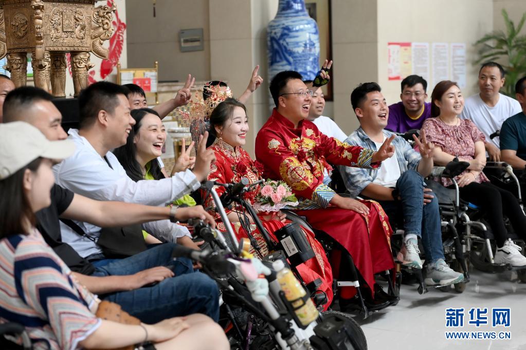 新郎周海云、新娘關美和親友們在婚禮上合影(6月15日攝)。新華社發(劉亮亮攝)
