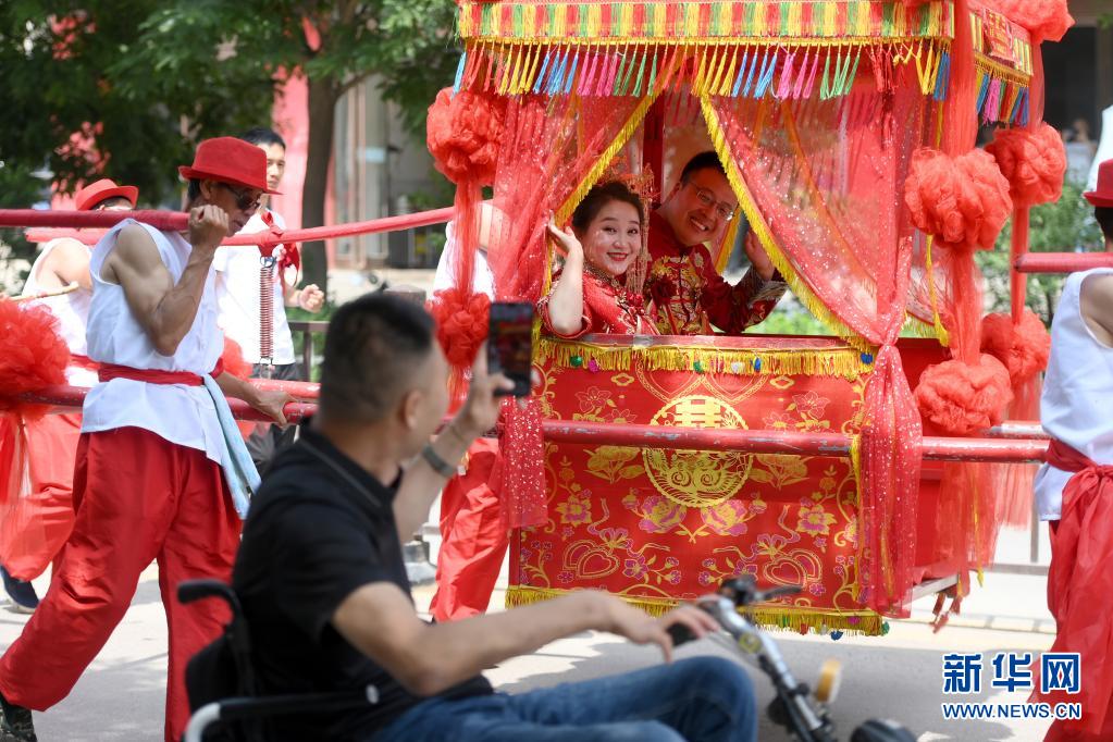 新郎周海云和新娘關美乘坐花轎前往婚禮儀式現(xiàn)場(6月15日攝)。新華社發(fā)(劉亮亮攝)