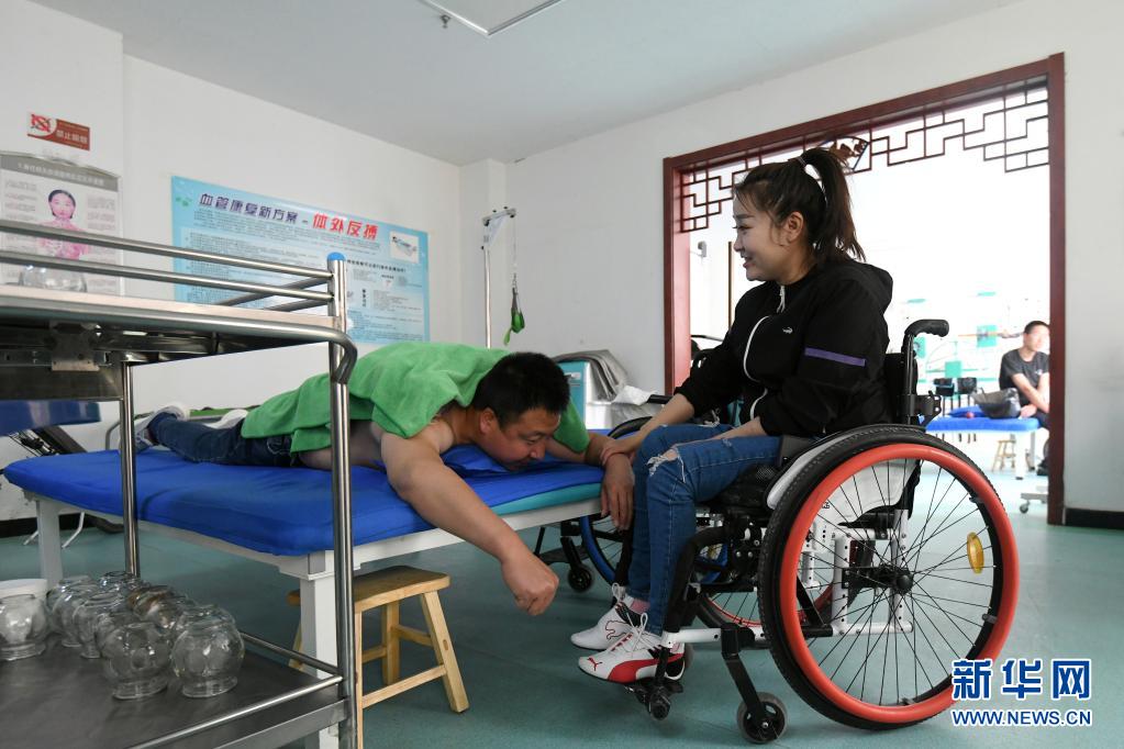 在山西省呂梁市石樓縣中醫醫院,關美(右)陪著周海云進行康復訓練(6月2日攝)。新華社發(劉亮亮攝)