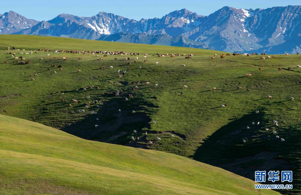 眼下,巴爾魯克山區的夏牧場迎來放牧黃金季。群山起伏,峰巒翠綠,氈房、牛羊等牲畜分散點綴其間,自駕游客時而穿梭往來,共同譜寫一曲高山夏季牧歌。
