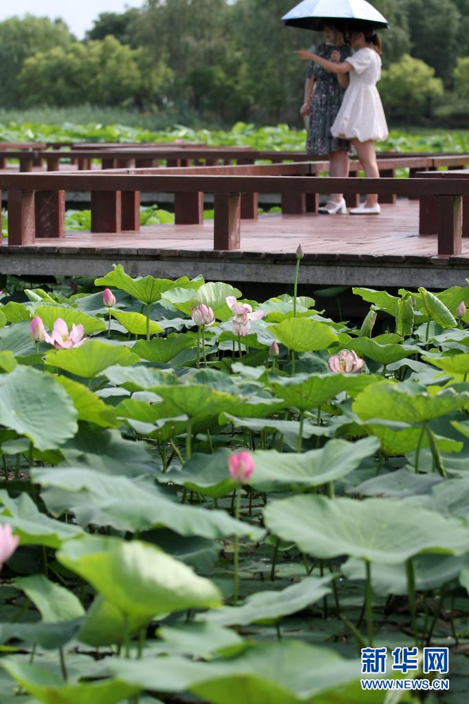 6月21日,在山東省濱州市博興縣麻大湖國(guó)家濕地公園百畝荷塘,游客在觀賞荷花。