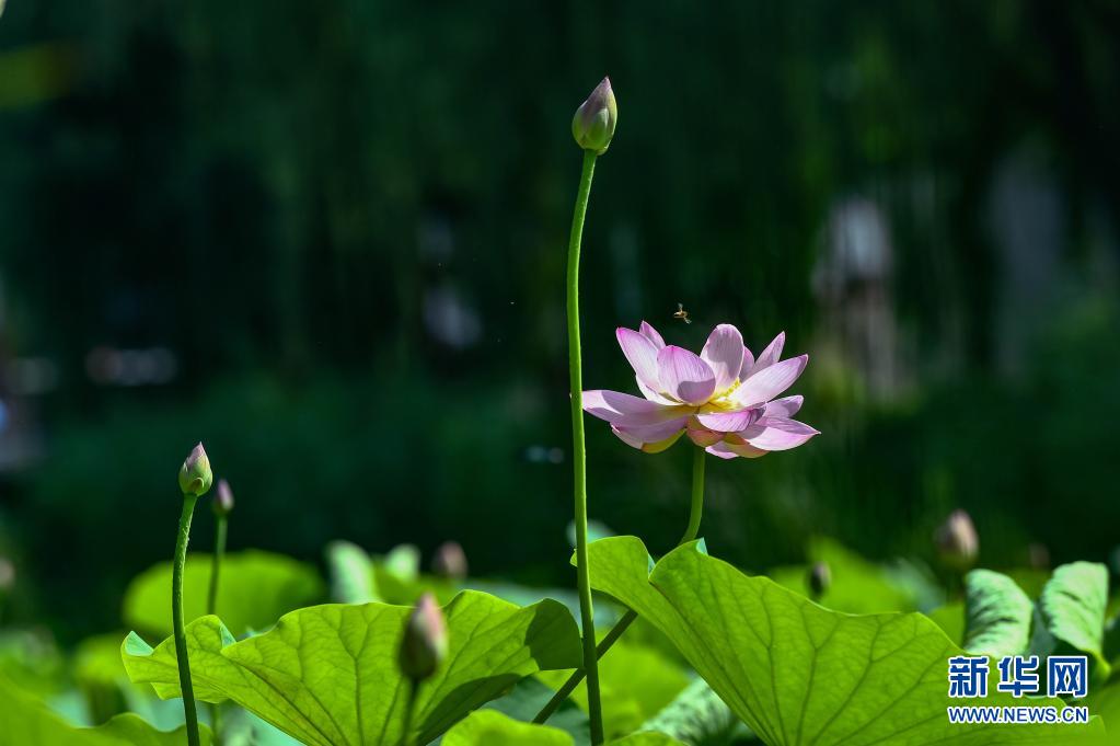 6月21日,蜜蜂飛舞在山東省青州市南陽(yáng)河景區(qū)的荷塘里。
