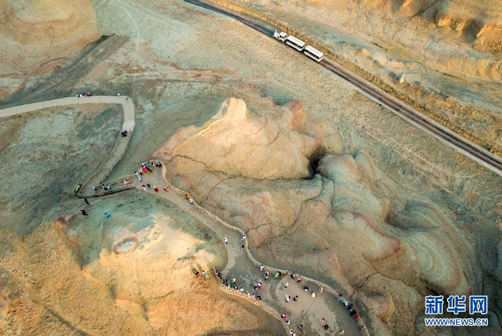 游客在新疆克拉瑪依烏爾禾世界魔鬼城景區內拍照游玩(6月21日攝,無人機照片)。