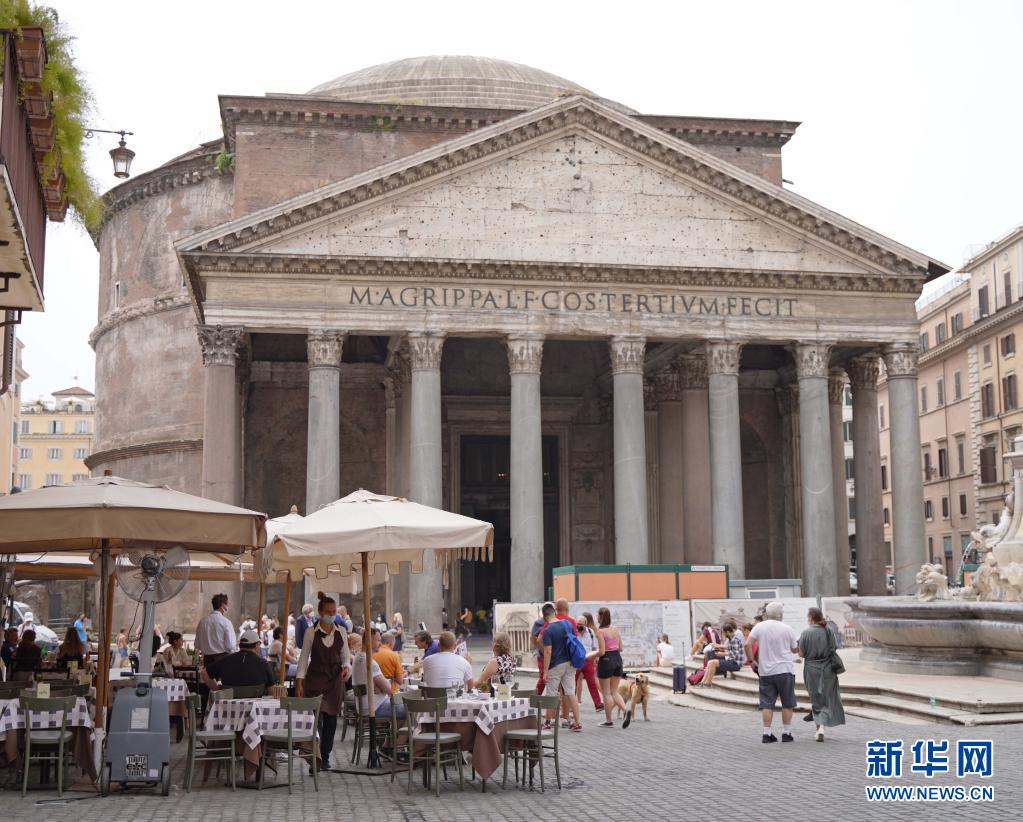 6月24日,人們在意大利羅馬萬神殿前一家餐館的戶外區域消費。