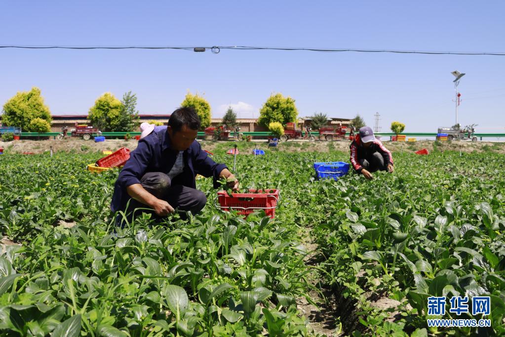 7月4日,在甘肅省張掖市甘州區烏江鎮供港蔬菜基地,當地群眾在采摘蔬菜。