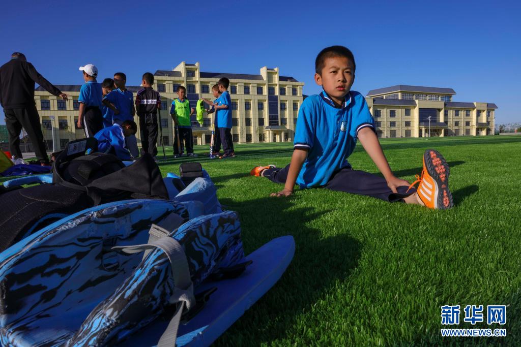 塔城市第二小學曲棍球隊的小隊員在訓練賽前拉伸身體,準備上場(6月13日攝)。
