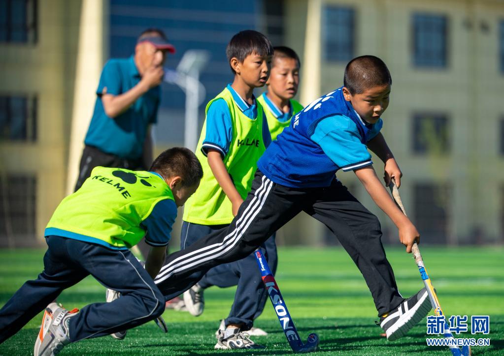 塔城市第二小學曲棍球隊員馬子豪(前右)在隊內訓練賽中和隊友拼搶(6月13日攝)。