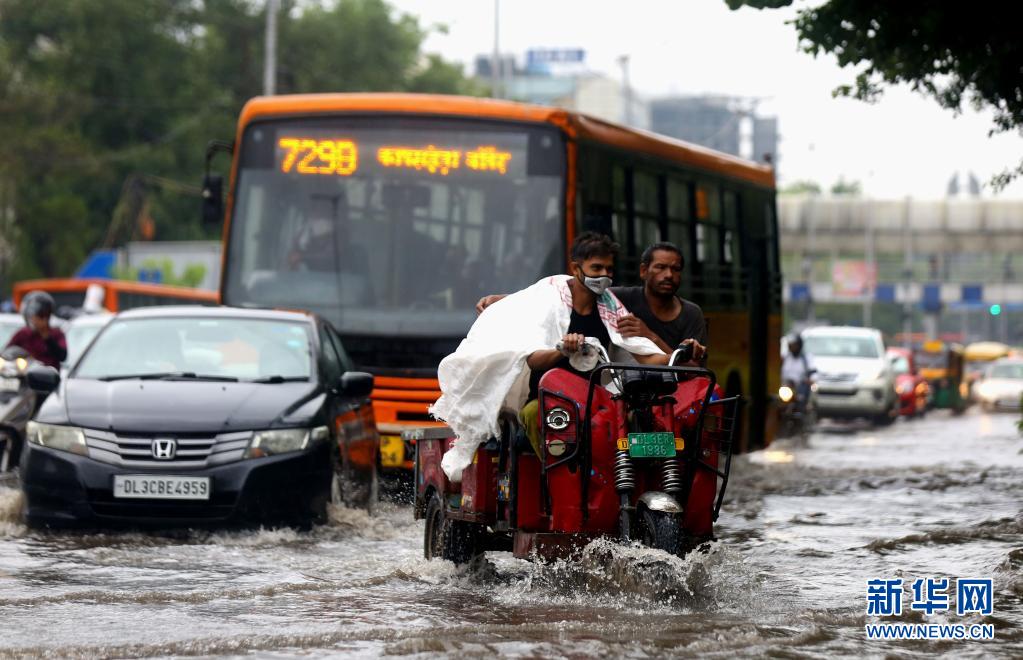 7月14日,車輛在印度新德里積水的街道上行進(jìn)。