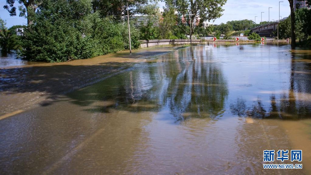 這是7月17日拍攝的荷蘭林堡省魯爾蒙德鎮被洪水淹沒的路面。