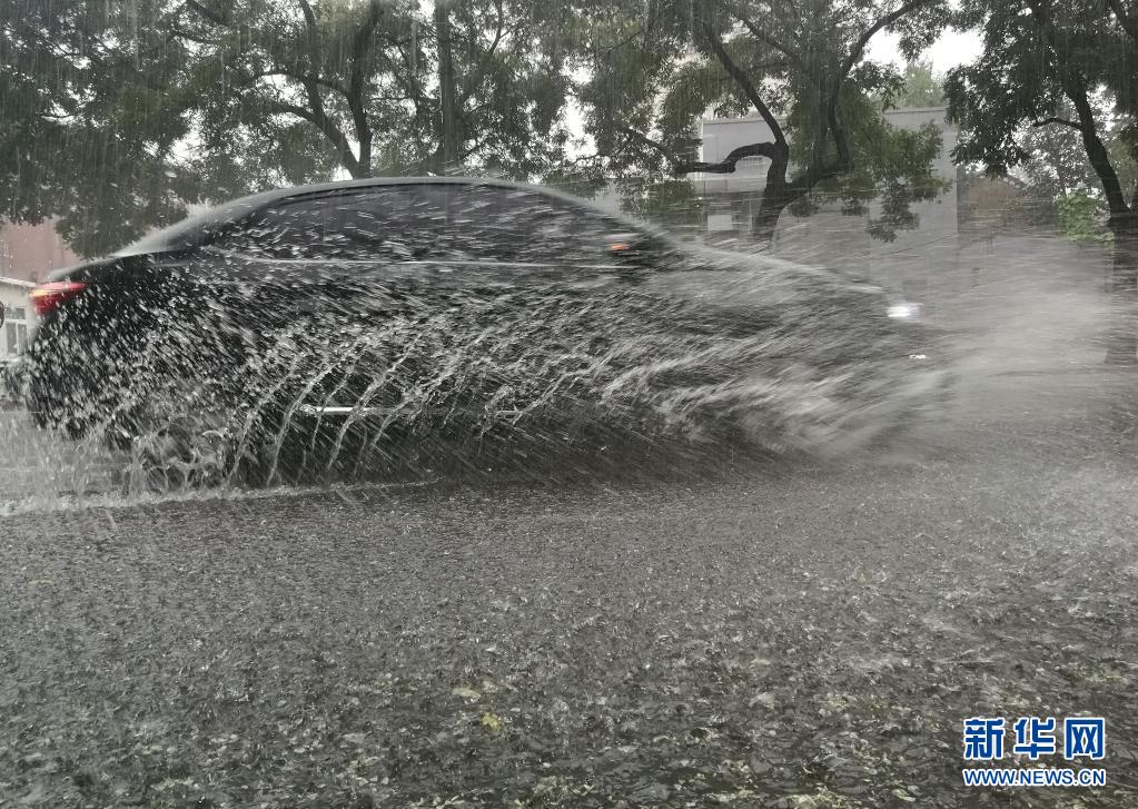 7月27日,在北京西單附近,汽車在雨中前行(手機(jī)拍攝)。