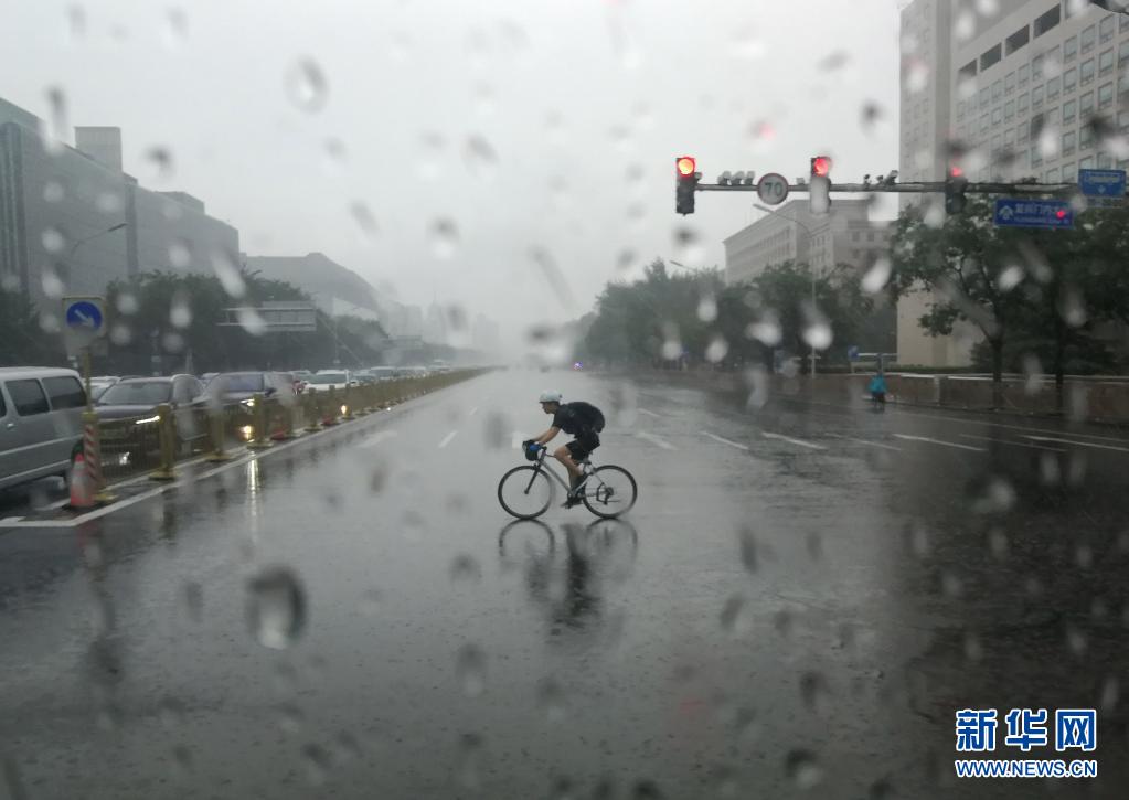 7月27日,騎行者冒雨經過北京西單路口(手機拍攝)。