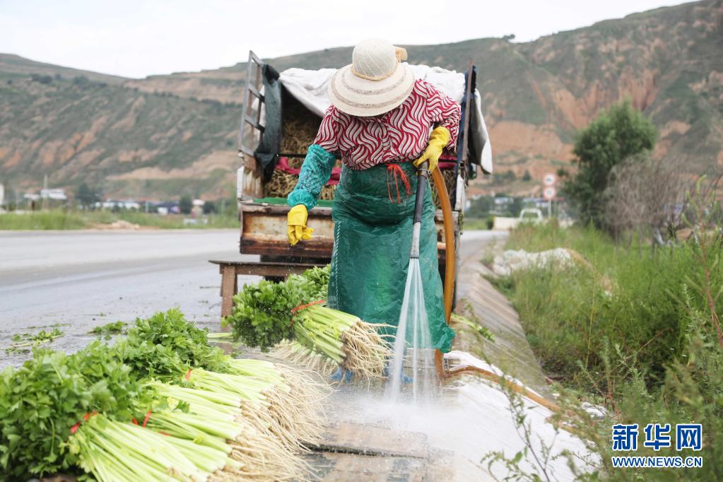 7月27日,甘肅省定西市安定區鳳翔鎮中川村村民在清洗芹菜。新華社發(王克賢 攝)