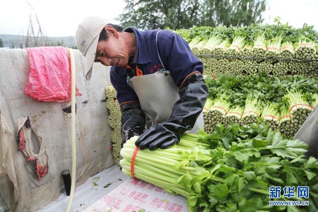 7月27日,甘肅省定西市安定區鳳翔鎮中川村村民將芹菜裝車。新華社發(王克賢 攝)