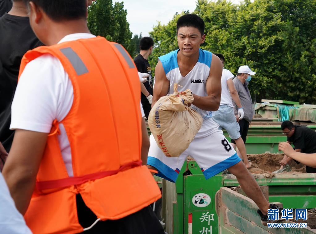 當日,在河南省鶴壁市浚縣傅莊堤上,不少群眾自發前來和救援人員一起裝沙袋、運沙袋,共筑堤壩。受持續強降雨影響,??h防汛形勢嚴峻,傅莊堤主要為??h縣城及26個村莊提供保護。新華社記者 李安 攝