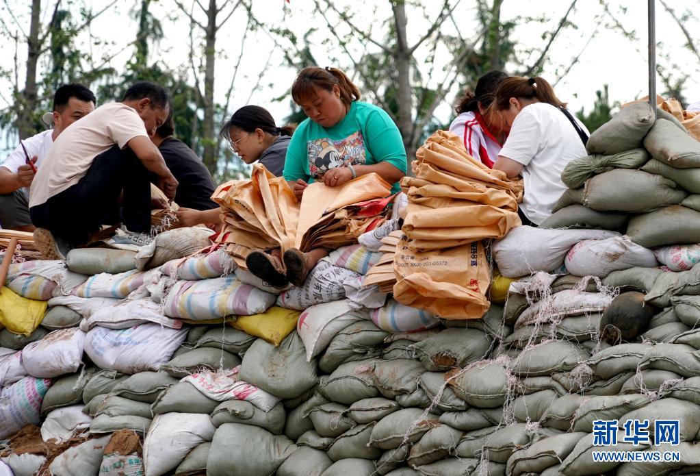 當日,在河南省鶴壁市浚縣傅莊堤上,不少群眾自發前來和救援人員一起裝沙袋、運沙袋,共筑堤壩。受持續強降雨影響,浚縣防汛形勢嚴峻,傅莊堤主要為浚縣縣城及26個村莊提供保護。新華社記者 李安 攝