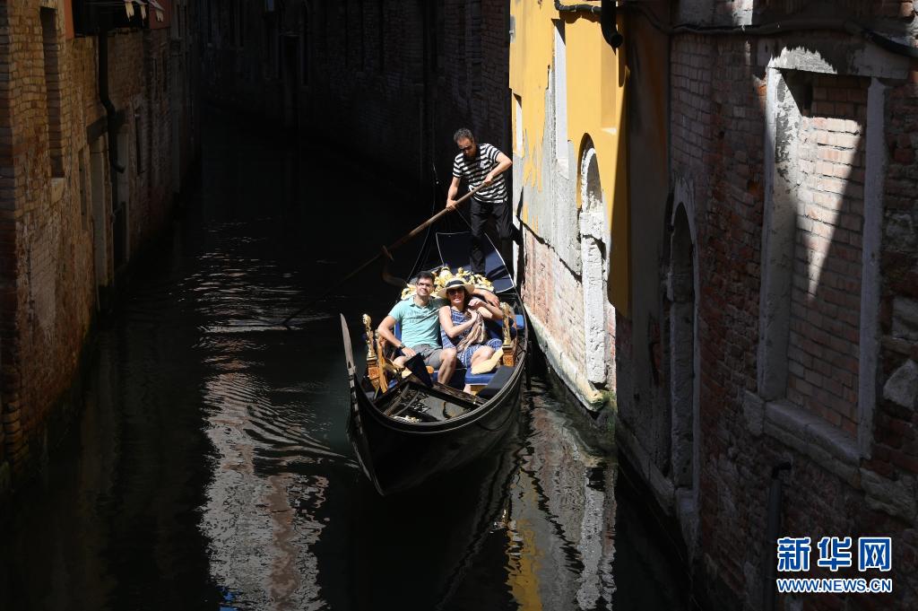 8月3日,游客乘坐“貢多拉”船游覽意大利威尼斯。