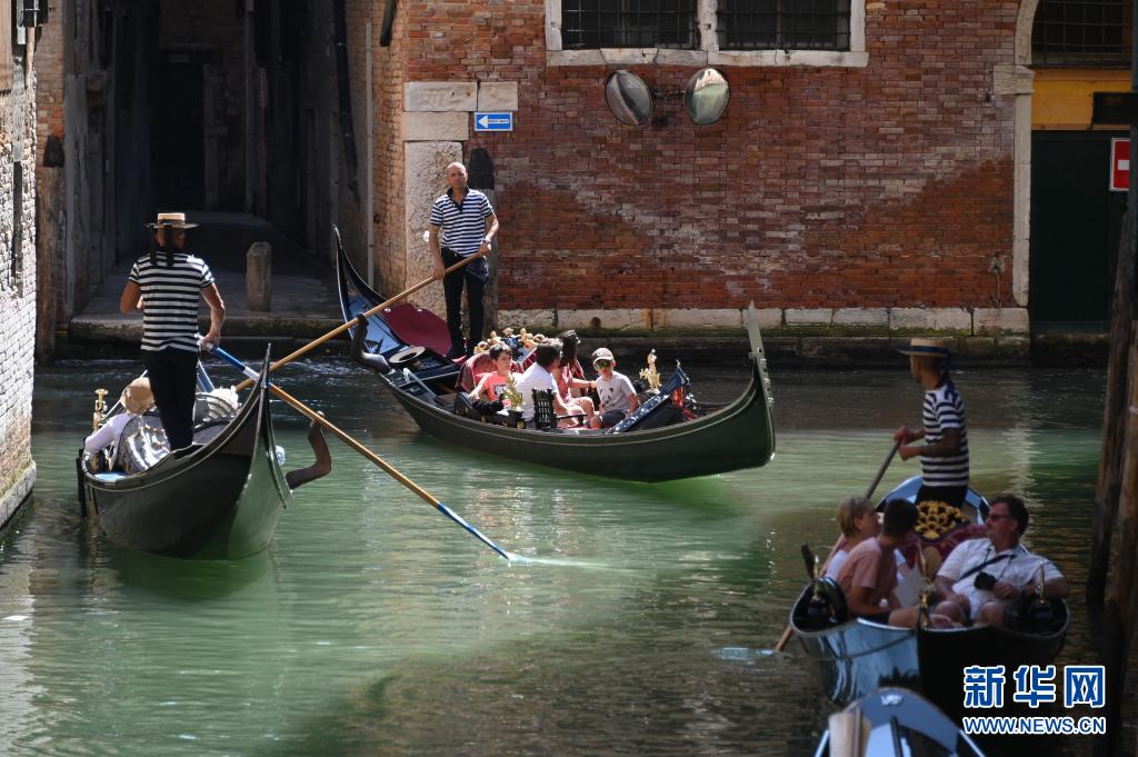 8月3日,游客乘坐“貢多拉”船游覽意大利威尼斯。