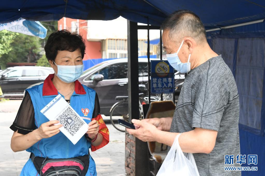 在北京市海淀區薊門里社區出入口,董星梅(左)指導進入社區的人員掃描健康寶(8月11日攝)。